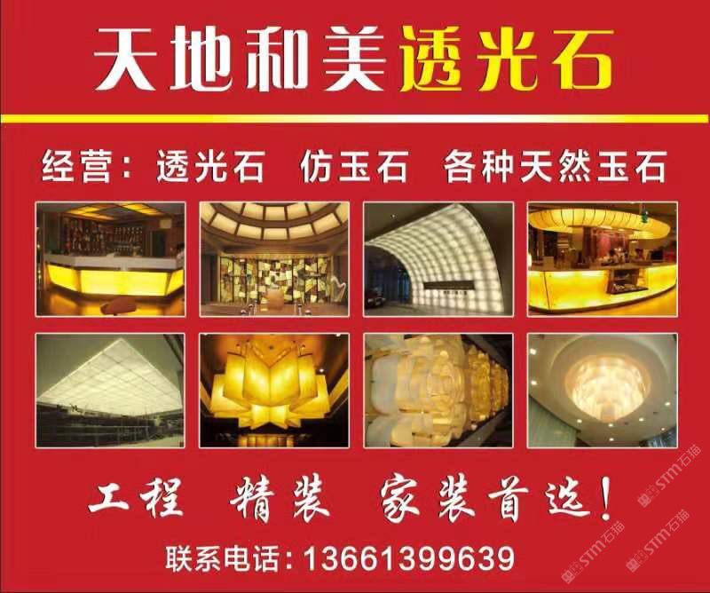 天地和美建材(北京)有限公司專業(yè)生產(chǎn)透光石、雪花石、美潔石、鳳凰石、真藏石、植物標本生態(tài)石、云石燈飾及玉石臺盆的企業(yè),本企業(yè)擁有獨立的生產(chǎn)車間,先進、一流的生產(chǎn)設(shè)備和精湛的生產(chǎn)技術(shù),另外,本企業(yè)擁有雄厚的設(shè)計能力和生產(chǎn)制造體系,產(chǎn)品選用優(yōu)質(zhì)的材料進行加工生產(chǎn),生產(chǎn)過程嚴格按照質(zhì)量管理體系執(zhí)行,并且已通過ISO9000管理體系認證,從而使產(chǎn)品達到品質(zhì)穩(wěn)定可靠、價格低廉優(yōu)惠、外觀時尚大方、進而使產(chǎn)品享譽國內(nèi)外,遠銷海內(nèi)外。本企業(yè)生產(chǎn)的產(chǎn)品廣泛應(yīng)用于燈飾、透光吊燈、燈柱、地面透光柱、透光吧臺、透光背景墻、櫥柜臺面、浴室臺面、窗臺面、洗面臺、廚衛(wèi)墻面、餐桌面、茶幾等,同時產(chǎn)品具有重量輕、硬度高、防火抗磨、耐酸、耐堿、耐腐蝕、無輻射、無縫連接、透光度強等多動能特點,也屬于新型環(huán)保裝飾材料,被配套使用于住宅、別墅、酒店、會所、商場及各大大型工程室內(nèi)外裝飾等眾多場合。本企業(yè)秉承“品質(zhì)至上,信譽”的宗旨和完善的售前售后服務(wù),贏得了廣大客戶和消費者的一致好評,熱誠歡迎各界人士前來選購、批發(fā)、工程咨詢、燈飾設(shè)計、來圖來樣定做,也歡迎各界人士蒞臨指導(dǎo)。