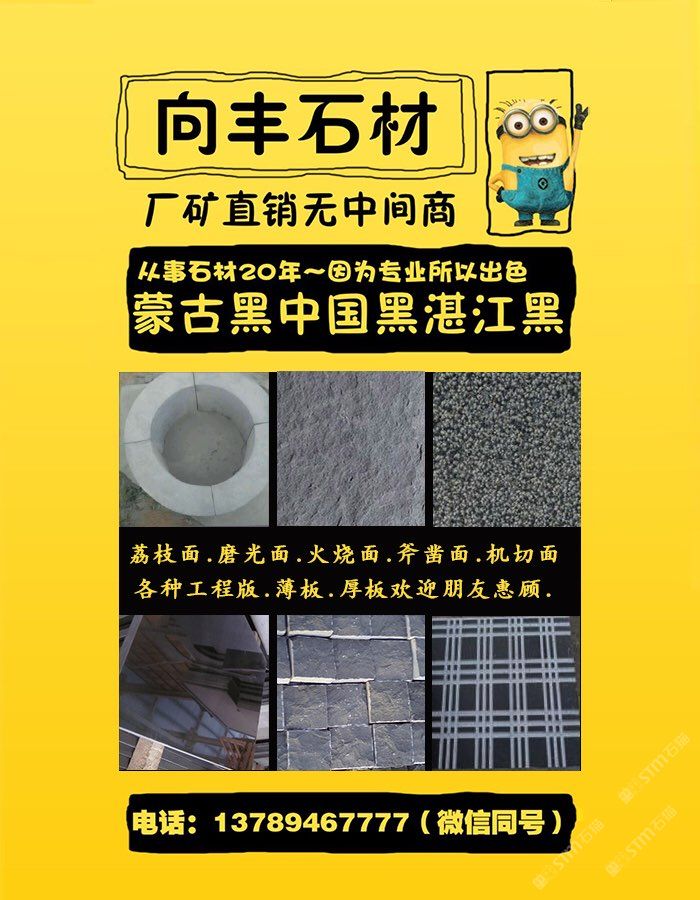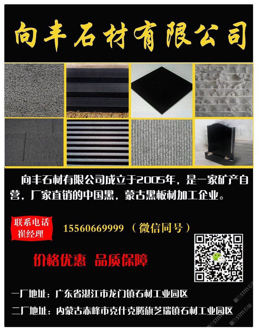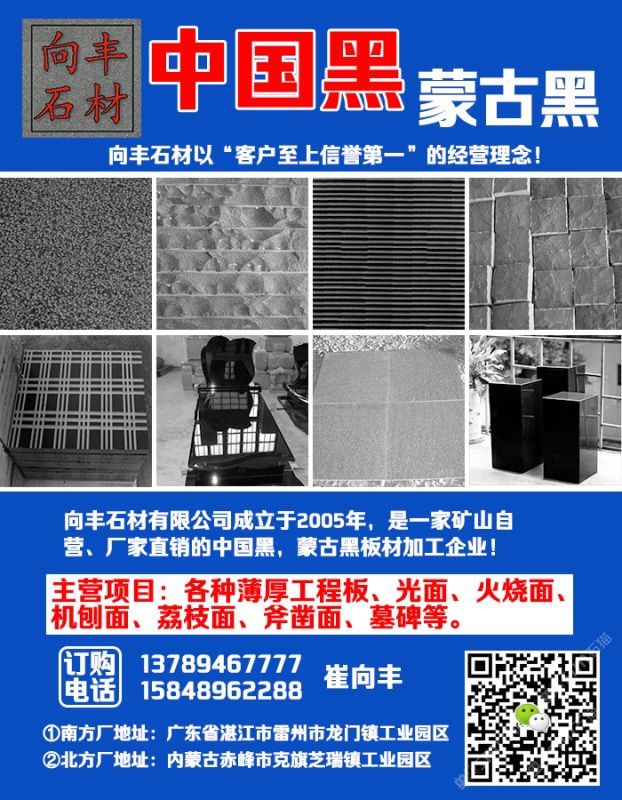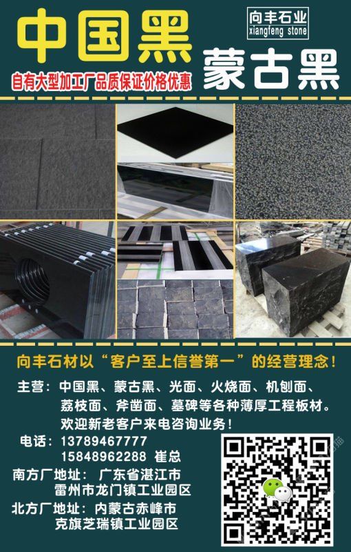 向豐石材有限公司成立于2005年,是一家礦山自營的蒙古黑板材加工企業(yè)!主營項目:各種薄厚工程板、光面、火燒面、機刨面、荔枝面、斧鑿面、墓碑等。向豐石材以“客戶至上信譽”的經(jīng)營理念,先進(jìn)的技術(shù)和現(xiàn)代化管理為基石,不斷的開拓創(chuàng)新與時俱進(jìn)?,F(xiàn)已經(jīng)發(fā)展為南北方跨區(qū)域生產(chǎn)企業(yè),至今完成多個大型項目并多次中標(biāo)。高效的生產(chǎn),優(yōu)質(zhì)的產(chǎn)品得到業(yè)主單位的好評,樹立了良好的企業(yè)形象。我們堅信,以“質(zhì)量求生存,誠信為根本”一定會贏得更好的明天!