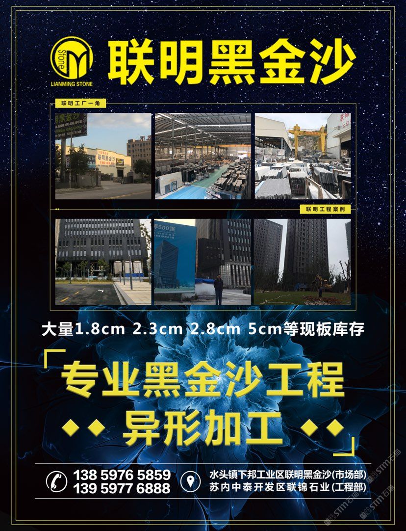 【聯(lián)明?黑金沙】——大工廠的規(guī)模和質(zhì)量,小廠的價(jià)格。兩工廠共占地35左右畝地,一廠為市場(chǎng)部位于水頭鎮(zhèn)下邦工業(yè)區(qū),二廠為工程運(yùn)營(yíng)中心位于石井中泰集控區(qū),是一家集礦山、生產(chǎn)、加工為一體化的綜合性專業(yè)化石材工廠,有著十幾年的黑金沙經(jīng)驗(yàn),公司主要經(jīng)營(yíng)黑金沙市場(chǎng)板,工程板,黑金沙異型加工。工程案例有:1、上海楊浦區(qū)149項(xiàng)目中船大廈,黑金沙總用量3萬(wàn)平方;2、蒼南天和家園共3期,黑金沙總用量5萬(wàn)平方;