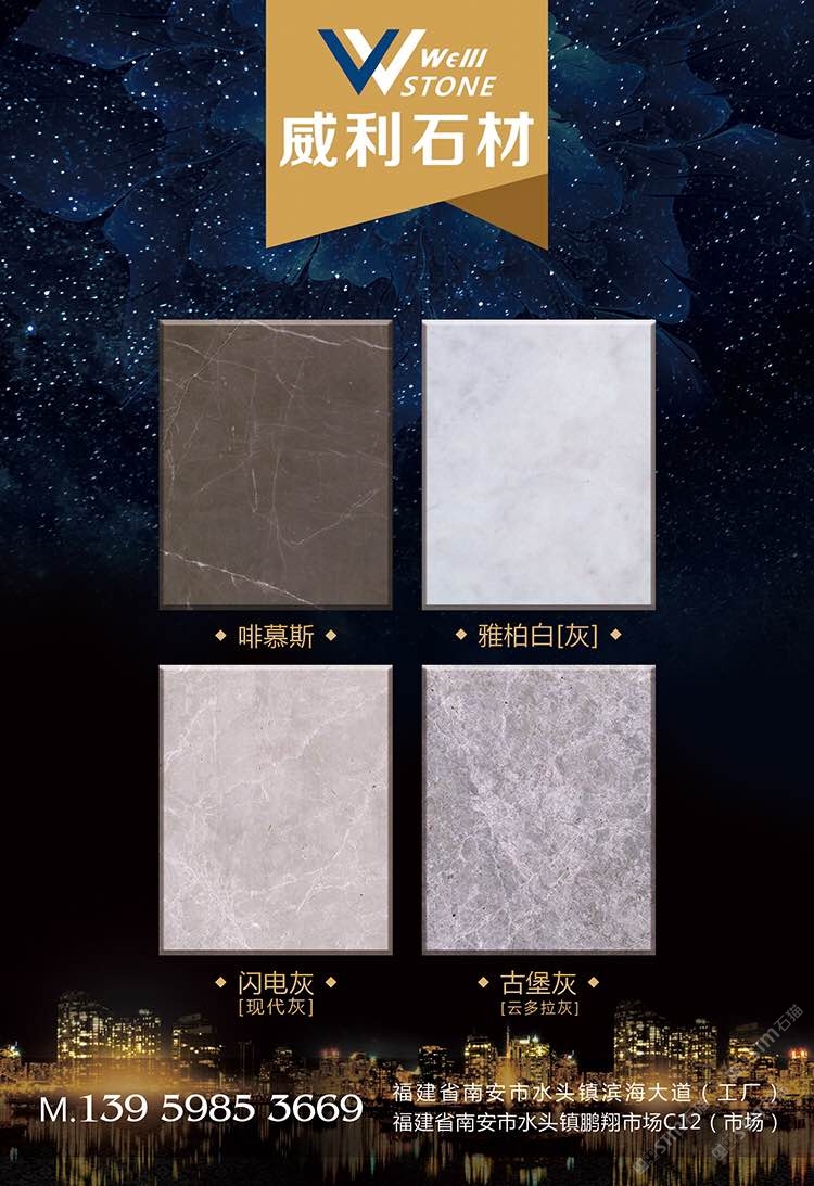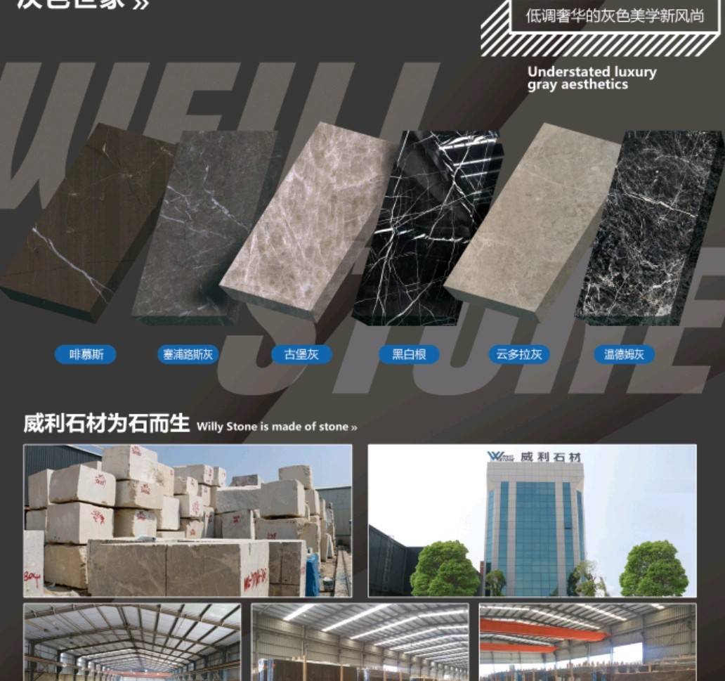 南安市威利石材有限公司成立于2008年,是一家集礦山開采、加工、銷售、工程設計施工、進出口貿易為一體的綜合型企業(yè)。我們不僅提供石材,更為您精心設計全套優(yōu)質的石材解決方案。 威利石材專注于石材產品的礦山荒料直銷、大板加工、大板展銷、工程設計、工程配套施工服務 。公司主營啡慕斯、黑白根、塞浦路斯灰、古堡灰,愛馬仕灰(溫德姆灰),雅柏白,閃電灰多種優(yōu) 質品種。公司已成為一家集專業(yè)化、產業(yè)化和規(guī)模化的工程材料采購、加工配套服務商。 威利石材以自己多年專業(yè)化和國際化的經營,與國內外礦山建立了良好的商業(yè)信譽和經貿合作關 系,贏得了國外礦山在中國區(qū)營銷戰(zhàn)略的全力支持。 威利石材依靠豐富的礦山資源,先進的管理、施工經驗,堅持“以市場為導向、以技術為主體、 以質量為命脈、以效益為中心”,大膽探索,在技術進步、生產經營、企業(yè)管理、產品質量、售后服務等 方面始終走在行業(yè)的前列。并在信守“質量為準、信譽優(yōu)等、服務為上”的企業(yè)精神指導下,產品暢銷世 界各地,深得消費者的信賴和贊譽。我們時刻把握時代脈搏,走在市場前沿,揮灑石材文化,增添人類輝煌。多年來我們一直致力于服務質量的提高?!邦櫩蜑樯稀?、“追求圓滿”已經融入到公司的企業(yè)文化、經營 理念當中,并且在產品生產、過程服務、售后追蹤等具體工作中得到落實。 我們的追求——集世界美石,為中國添彩!\ \ \ 地址:南安市水頭鎮(zhèn)濱海工業(yè)區(qū)\ 電話:13959853669\ 歡迎業(yè)務鏈接
