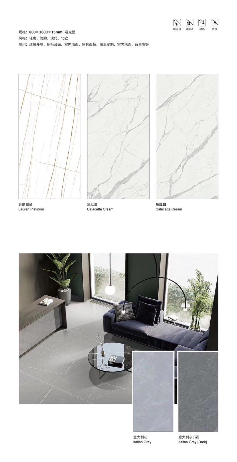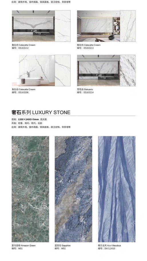 發(fā)布信息: ????SIBELAN 斯貝納巖板???? ????意大利設(shè)計(jì)師精選巖板???? 我們可以幫老總您加工為成品, 全國范圍內(nèi)可安排專業(yè)團(tuán)隊(duì)安裝. 做到您一次性采購 省心. 放心. 省時(shí). 低價(jià)! 巖板紋路版面全多達(dá)199 款 勵(lì)志做服務(wù)五星的巖板專業(yè)供應(yīng)商 魚肚白 雪花白 格蘭云天 寒江雪 爵士白 幻影灰 勞倫黑金 火山灰 亞馬遜 艾維拉 羅馬黑檀 貝特巖 細(xì)花白 羅馬灰 云朵拉灰 魚肚金 莎羅娜 莎羅蘭 勞倫白金 拉薩白 中花白 灰冰玉 卡拉拉白 撒金黑 清水玉 薩瓦灰 莎士比亞 大花灰 白冰玉 銀灰洞 阿瑪尼灰 綠紋玉 綠冰玉 藍(lán)紋玉 保加利亞灰 鐵銹 黑木紋 流砂灰 純白 純灰 純黑 TEL: 15905069590 聶 各種版面規(guī)格全部如下: 1200×600×11mm 啞光 1500×800×11mm 啞光 1800×900×11mm 啞光 1800×900×12mm 啞光 2600×800×15mm 啞光 2400×1200×6mm 啞光/亮光 2400×1200×9mm 啞光/亮光 2400×1200×15mm 啞光 2700×1200×6mm 啞光/亮光 2700×1600×12mm 啞光/亮光 3200×1600×6mm 啞光/亮光 3200×1600×12mm 啞光/亮光