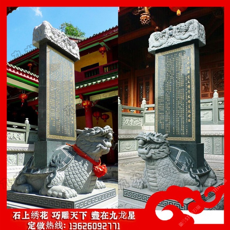 發(fā)布信息: 石雕龜馱碑?dāng)[件 龍龜馱碑圖片價(jià)格_九龍星石業(yè)。 石雕龜馱碑?dāng)[件又稱龜載碑、龍龜碑、烏龜碑、龜陀碑等。而確切的說(shuō),它應(yīng)該叫赑屃,傳說(shuō)中它是龍生九子之一,力大無(wú)窮而且性格好,又善背重東西。龍龜馱碑多用于寺廟和立碑紀(jì)念,因?yàn)辇敒殚L(zhǎng)壽的動(dòng)物,古人以此建碑,也是想保存千秋萬(wàn)載,讓碑流芳萬(wàn)古的寄托。 石雕龜馱碑又名霸下,形似龜,傳說(shuō)為龍九子之一.是老六,螭頭龜足,平生好負(fù)重,力大無(wú)窮,碑座下的龜趺是其遺像。傳說(shuō)霸下上古時(shí)代常馱著三山五岳,在江河湖海里興風(fēng)作浪。后來(lái)大禹治水時(shí)收服了它,并為治水作出了貢獻(xiàn),洪水治服了,大禹?yè)?dān)心它又到處撒野,便搬來(lái)頂天立地的特大石碑,上面刻上霸下治水的功跡,叫它馱著,沉重的石碑壓得它不能隨便行走。