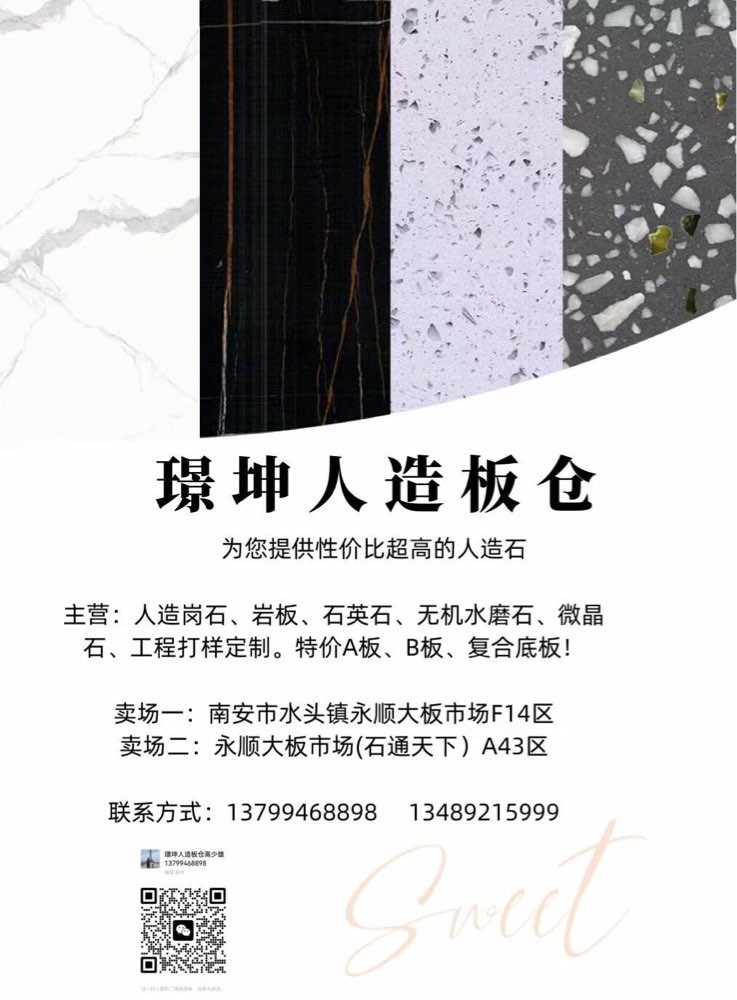 發(fā)布信息: 一璟坤人造板倉一 主營:人造崗石,石英石,巖板,無機(jī)水磨石, 微晶石,工程打樣定制,特價(jià)A板,B板,復(fù)合底板 賣場(chǎng)地址:福建省南安市水頭鎮(zhèn)永順大板市場(chǎng)A43區(qū),F(xiàn)10一F14區(qū)。財(cái)富熱線:13799468898高先生